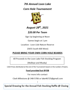 The Loon Lake Fish Management Program’s Corn Hole Tournament will be on August 28th at the Loon Lisle Nature Reserve. Sign up starts at noon with games beginning at 1:00pm. $20 per team. All proceeds will go towards fish stocking (Walleye & Musky). Cash prize distributed at the end of the tournament based on the number of teams.