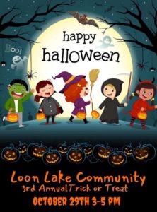 The 3rd Annual Loon Lake Community Trick or Treat will be on Saturday, October 29th from 3:00-5:00 PM.