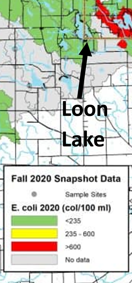 The third major contributor to Loon Lake’s water is the short ditch that runs from Old Lake. Old Lake’s water comes from New Lake. Ultimately the water from New and Old Lakes comes into Loon Lake.  The quality of the water coming from this inlet is typically very good since it comes from two lakes and is minimally influenced by agricultural runoff.