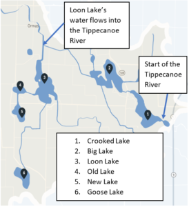 Loon Lake is in the upper portion of the Tippecanoe River Watershed.  We are a vital member of the Tippecanoe Watershed, and we are considered part of the headwaters of the Tippecanoe River.  The following is a simplified description of where our water comes from and where it ultimately goes.